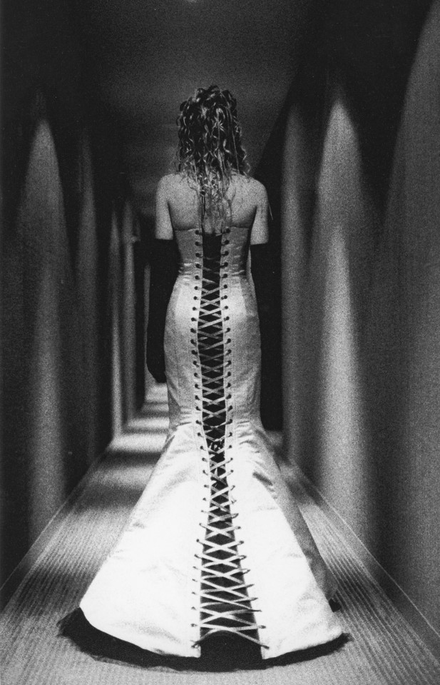 Elegant, form fitting mermaid corset gown. The dress is built over a form fitting steel boned English bobbinet corselet. The dress is heavy silver silk duchess satin, interlined with silk organza. The "under-dress" is black silk Georgette. Layers of net and tulle help create this unique shape.